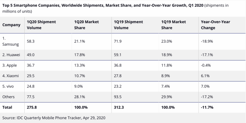 According to the research reports of 2020, worldwide smartphone shipments decreased by 11.7% (year on year) in the first quarter of 2020 due to the COVID-19 pandemic. The sales has decreased to 1.26 billion units, but the 11.7% YoY decrease is actually less than original estimations of 15.6%. Hence, the pandemic impact was lower than expected.